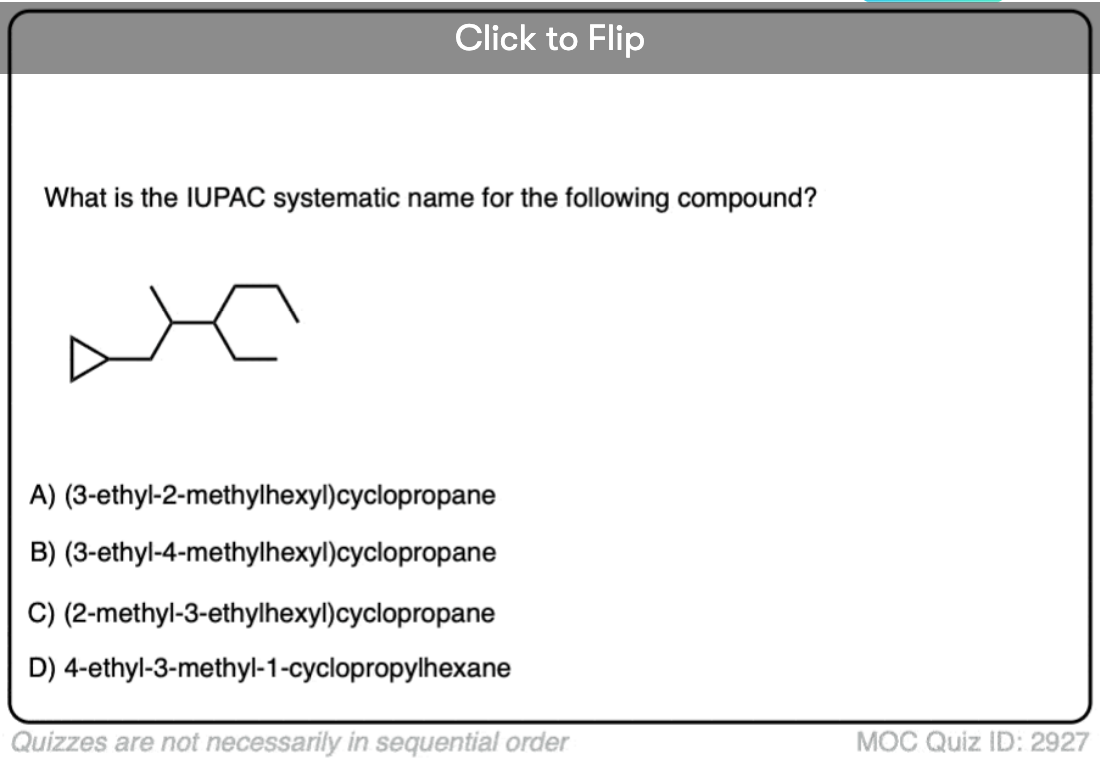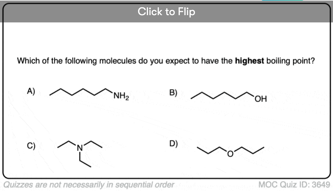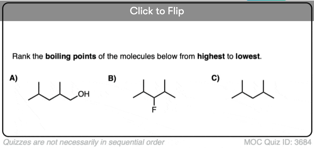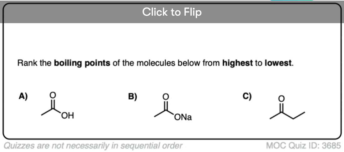 Here, just know the trends. Part 1 is recognizing the four intermolecular forces and how they affect boiling points. Part 2 is looking at other factors such as the molecular weight,  geometry, and number of polar functional groups in each molecule to make a decision. Melting points may also make an appearance.
