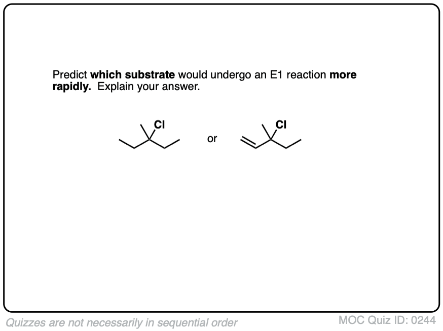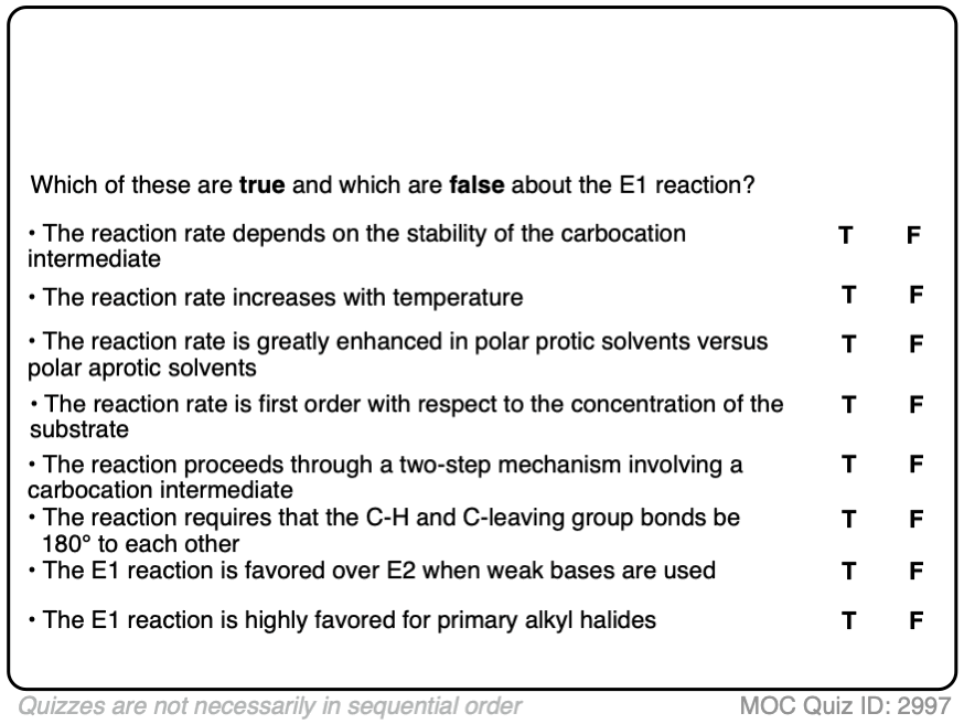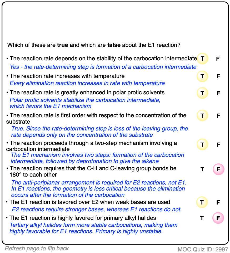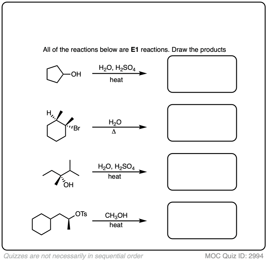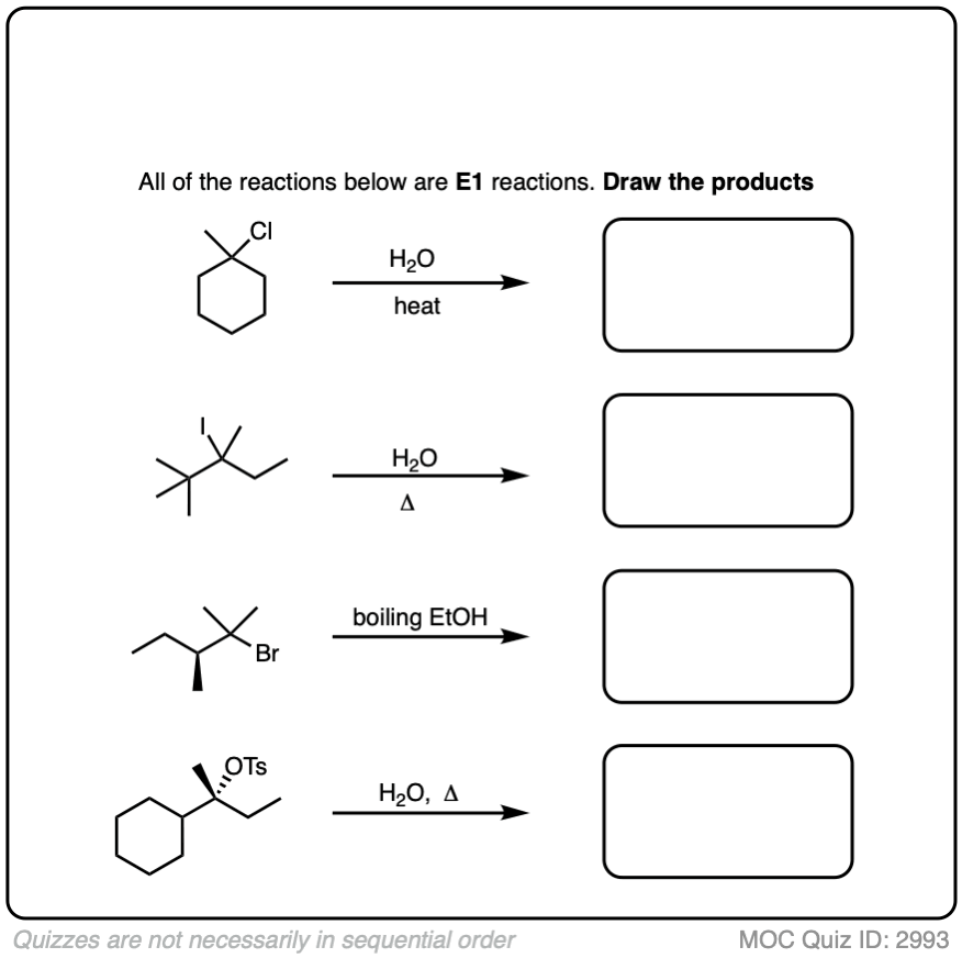 This page contains practice quizzes on the E1 reaction, including questions on the mechanism, rate equation, reaction coordinate and products of the E1 reaction as well as the E1 reaction with rearrangement.