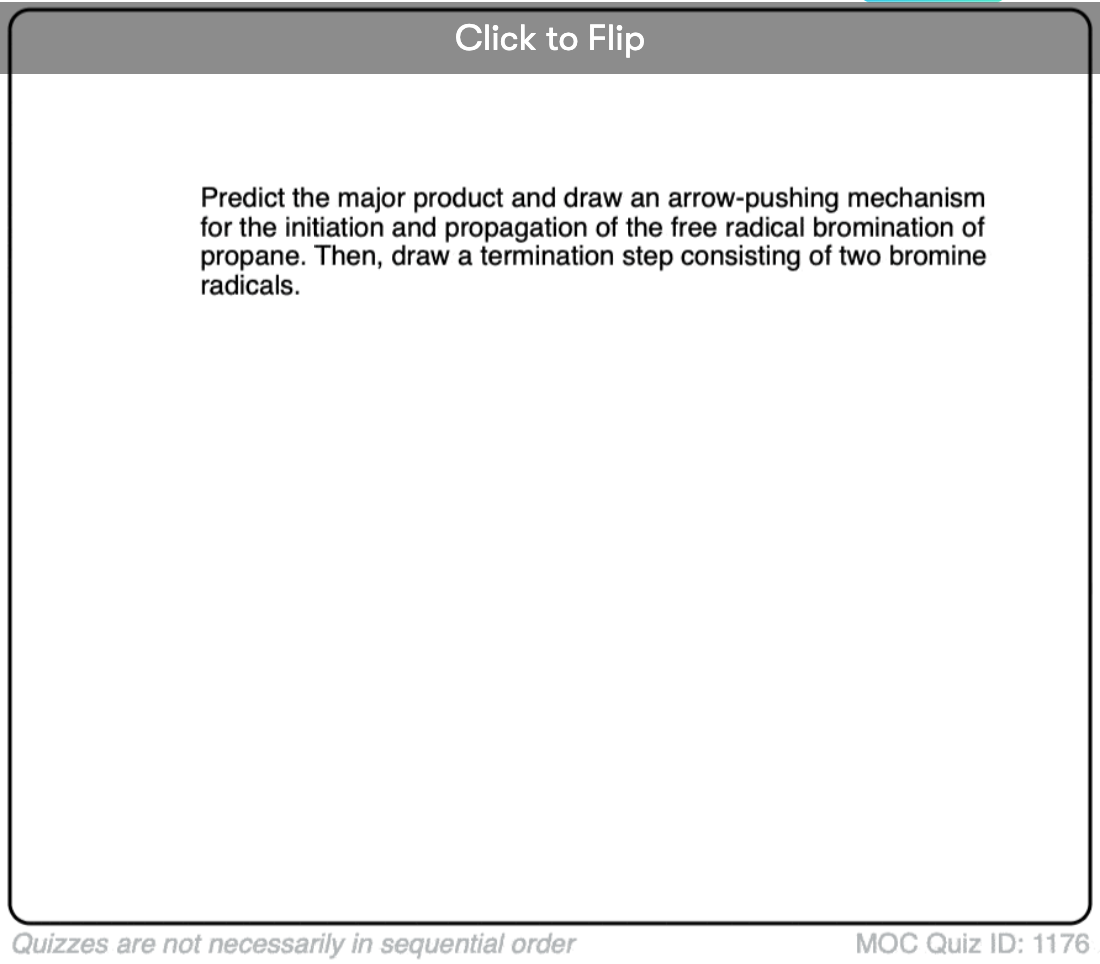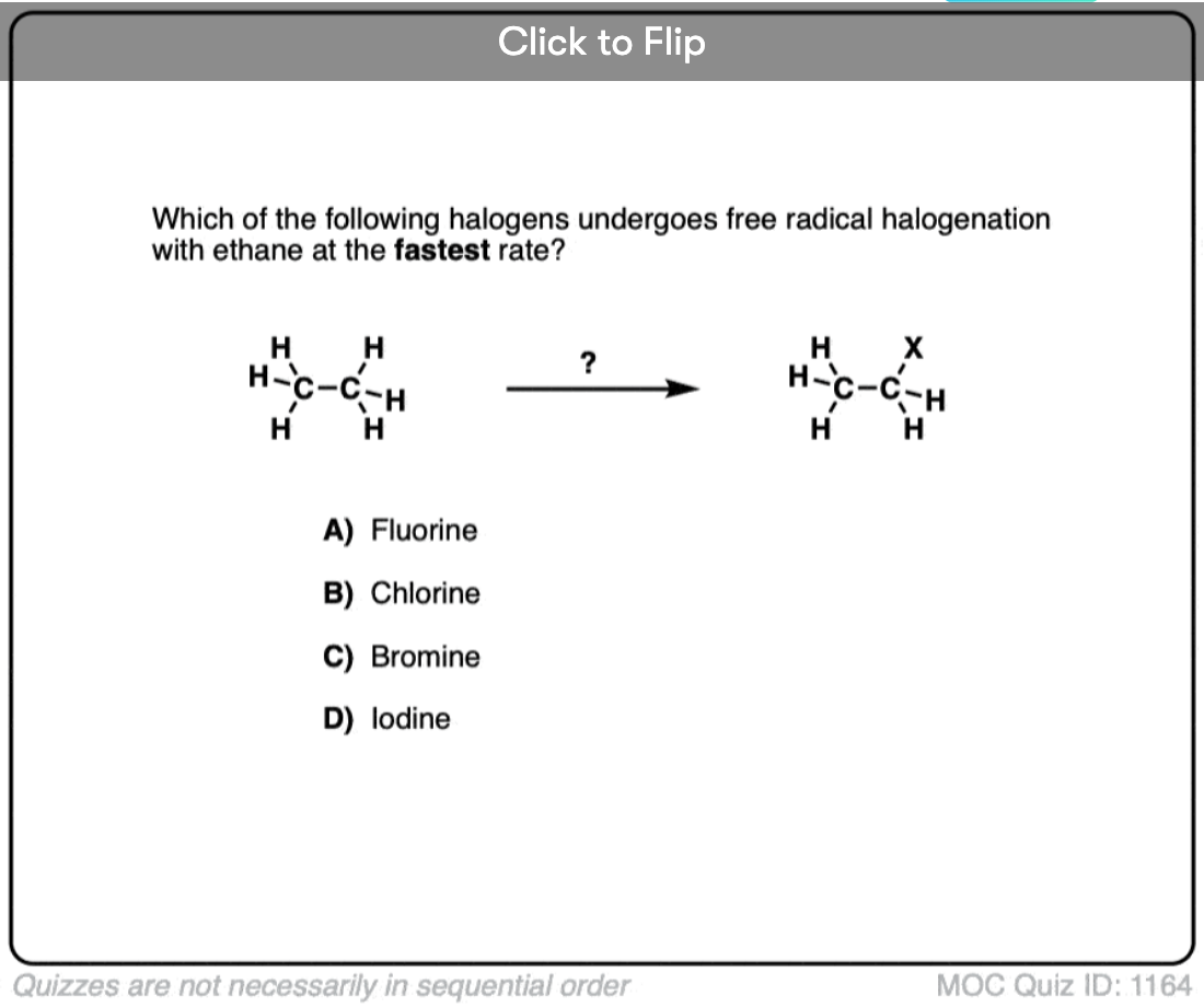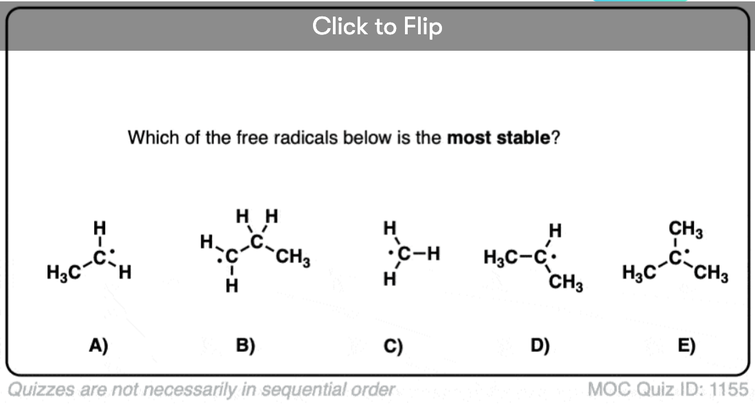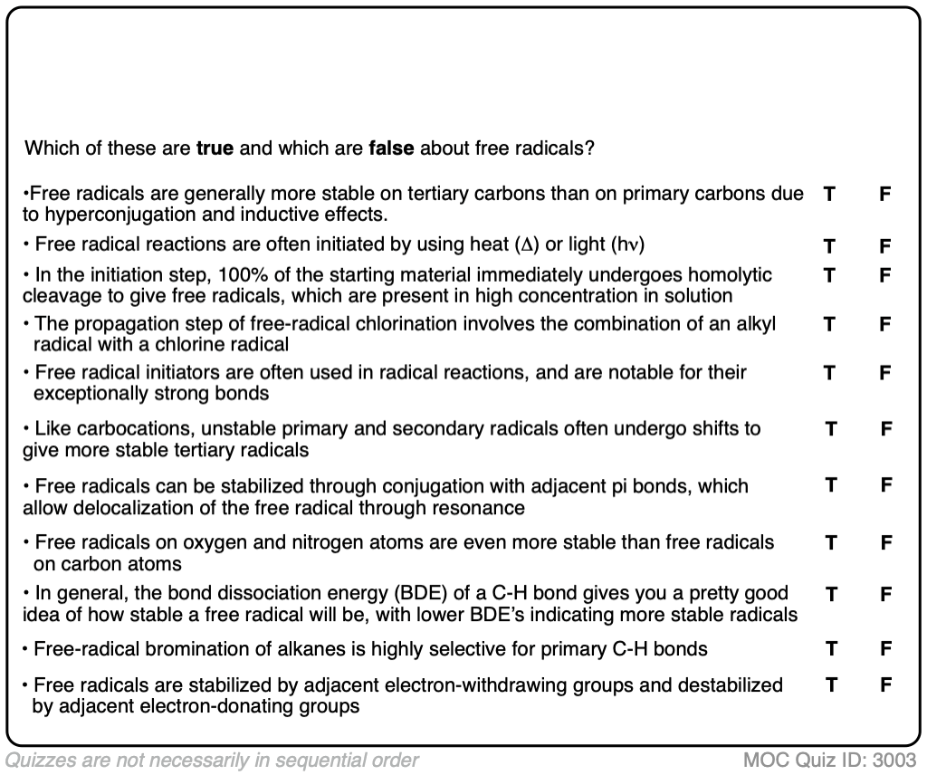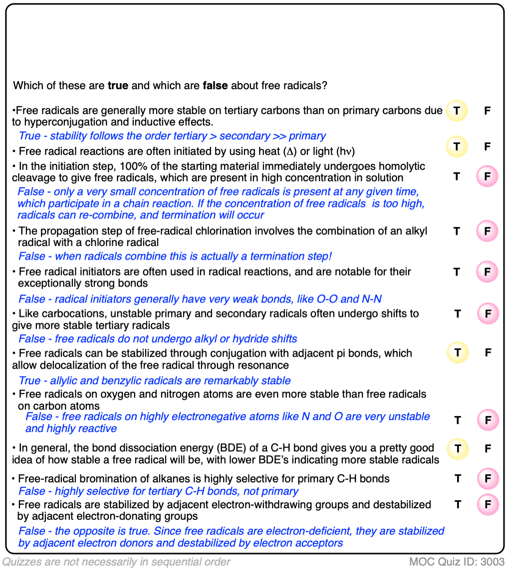 These practice questions cover the steps of free-radical reactions, stabilities of free radicals, the strengths of C-H bonds, the mechanisms of free radical reactions, the relative reactivity of various C-H bonds and various other topics related to free radicals.