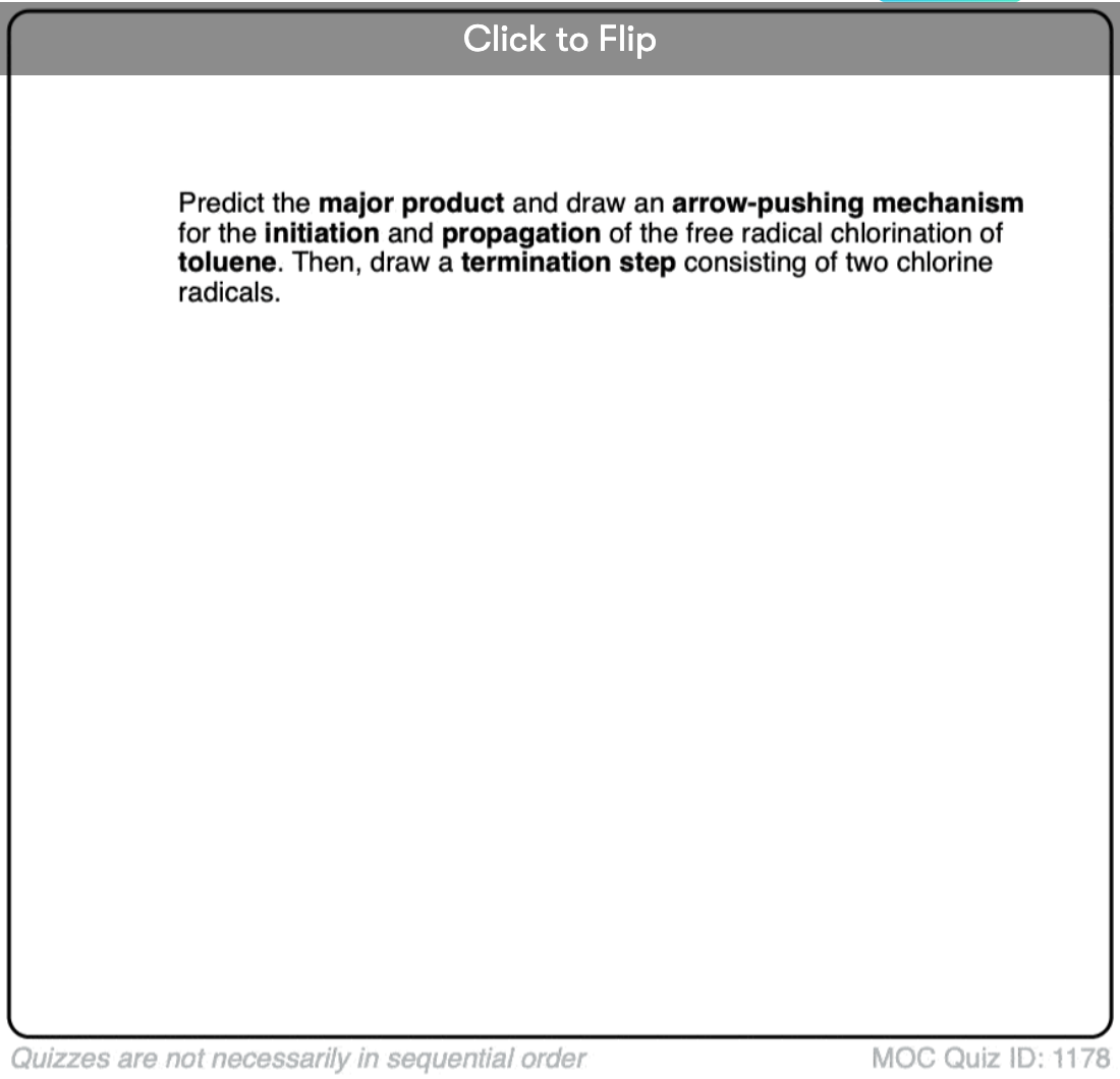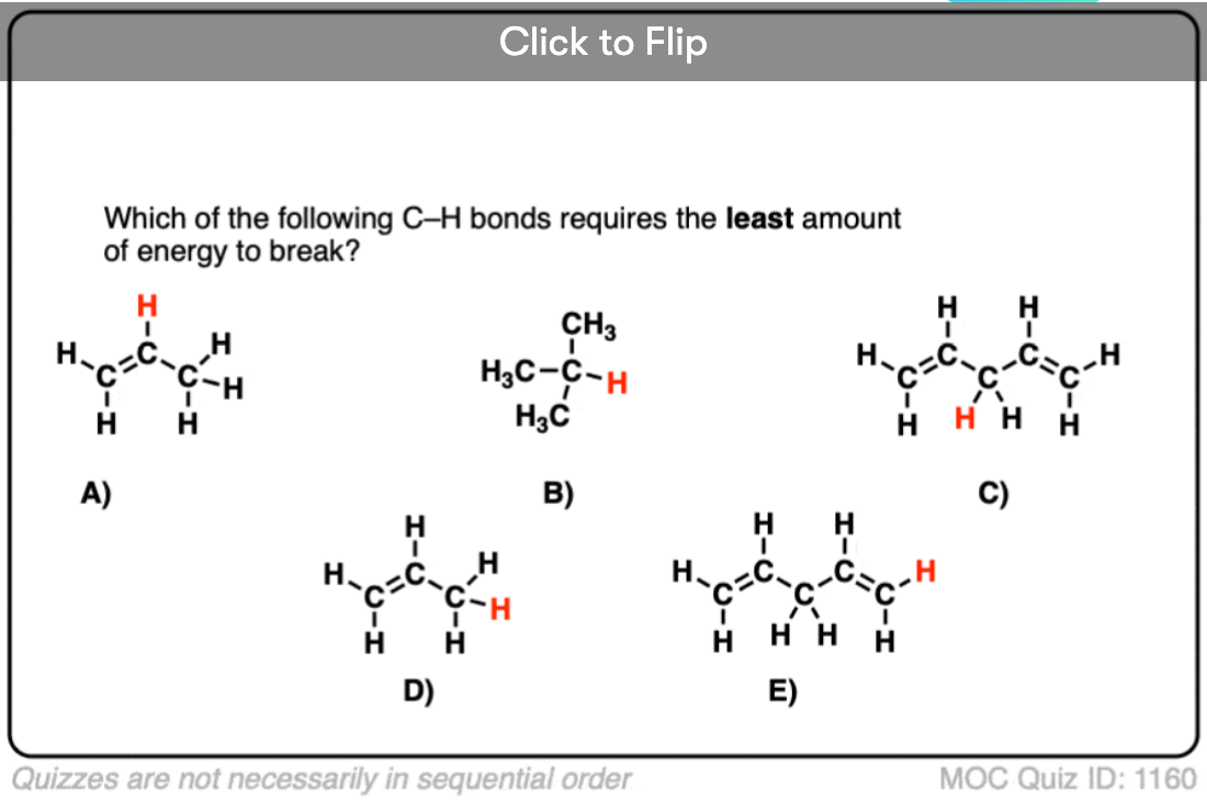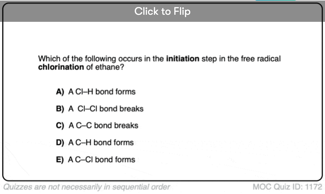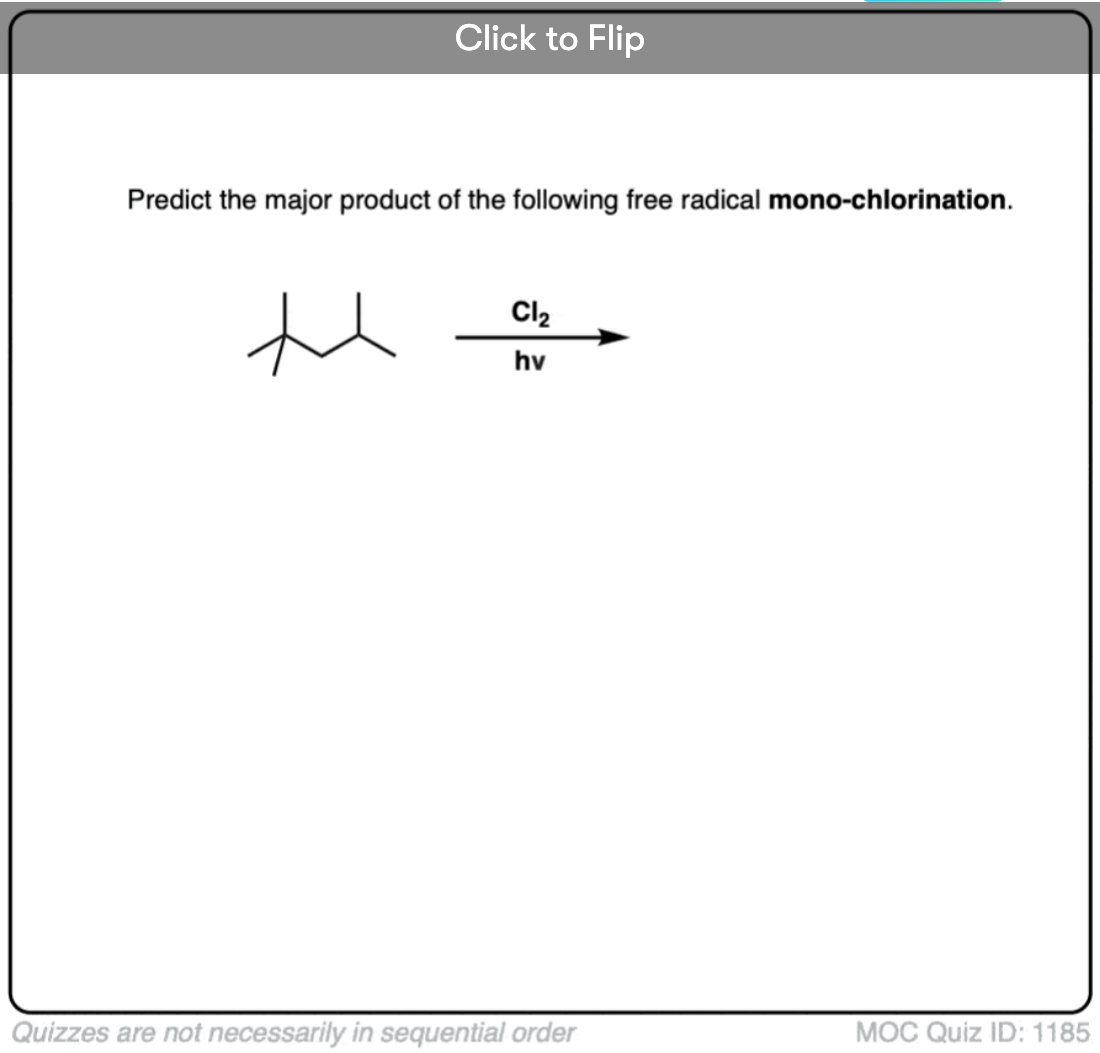 These practice questions cover the steps of free-radical reactions, stabilities of free radicals, the strengths of C-H bonds, the mechanisms of free radical reactions, the relative reactivity of various C-H bonds and various other topics related to free radicals.