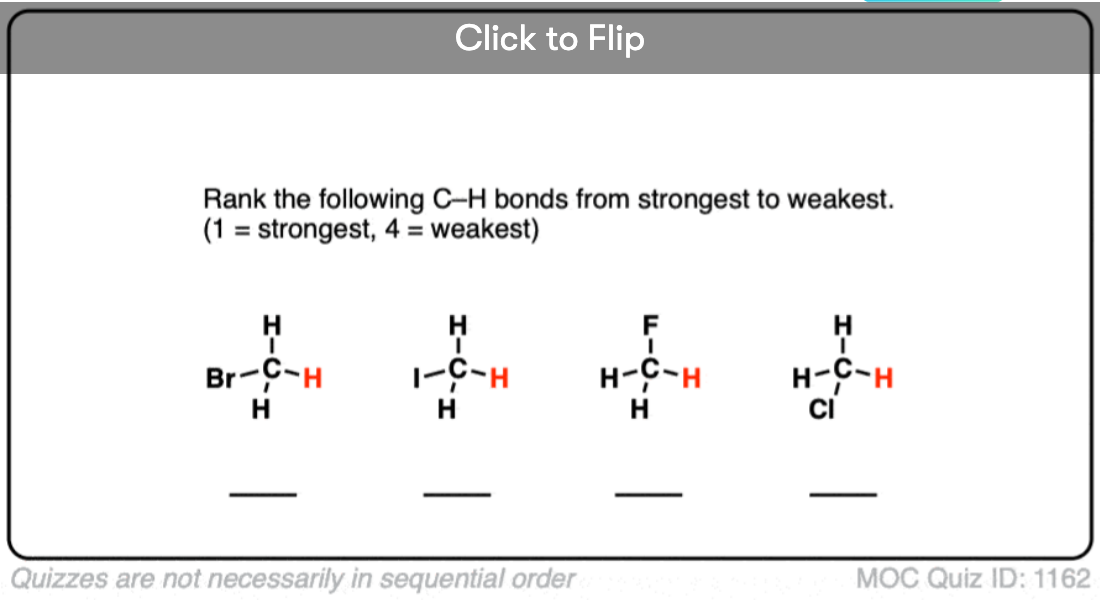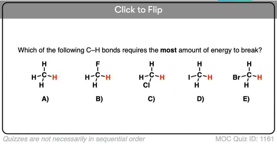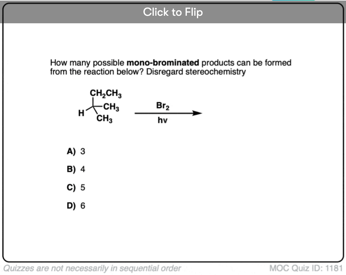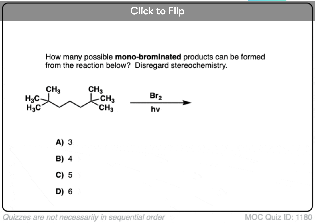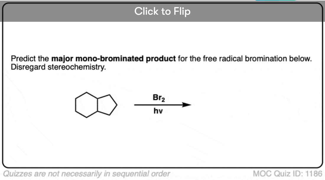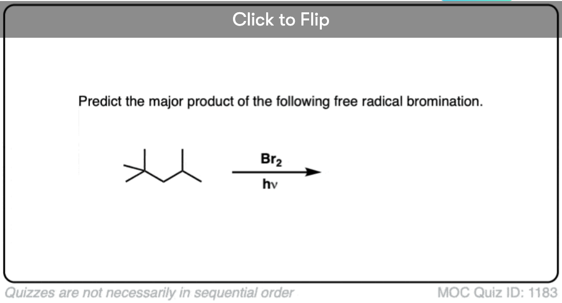 These practice questions cover the steps of free-radical reactions, stabilities of free radicals, the strengths of C-H bonds, the mechanisms of free radical reactions, the relative reactivity of various C-H bonds and various other topics related to free radicals.