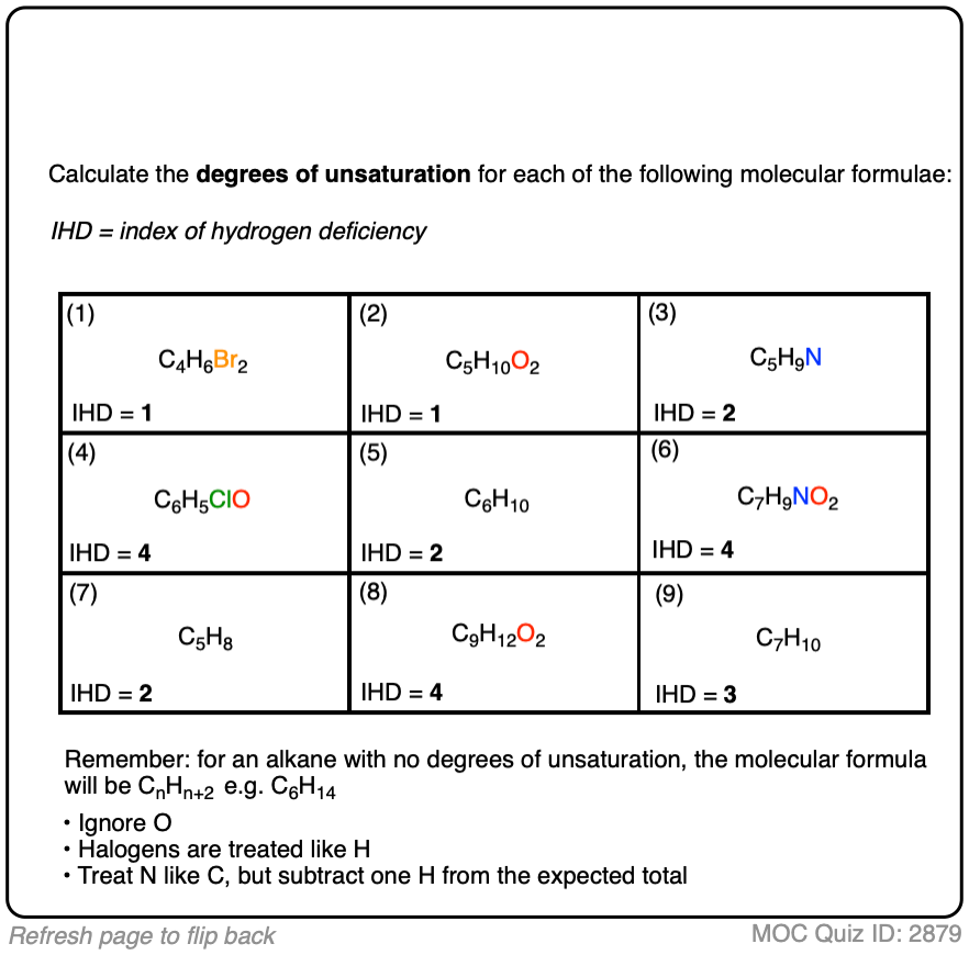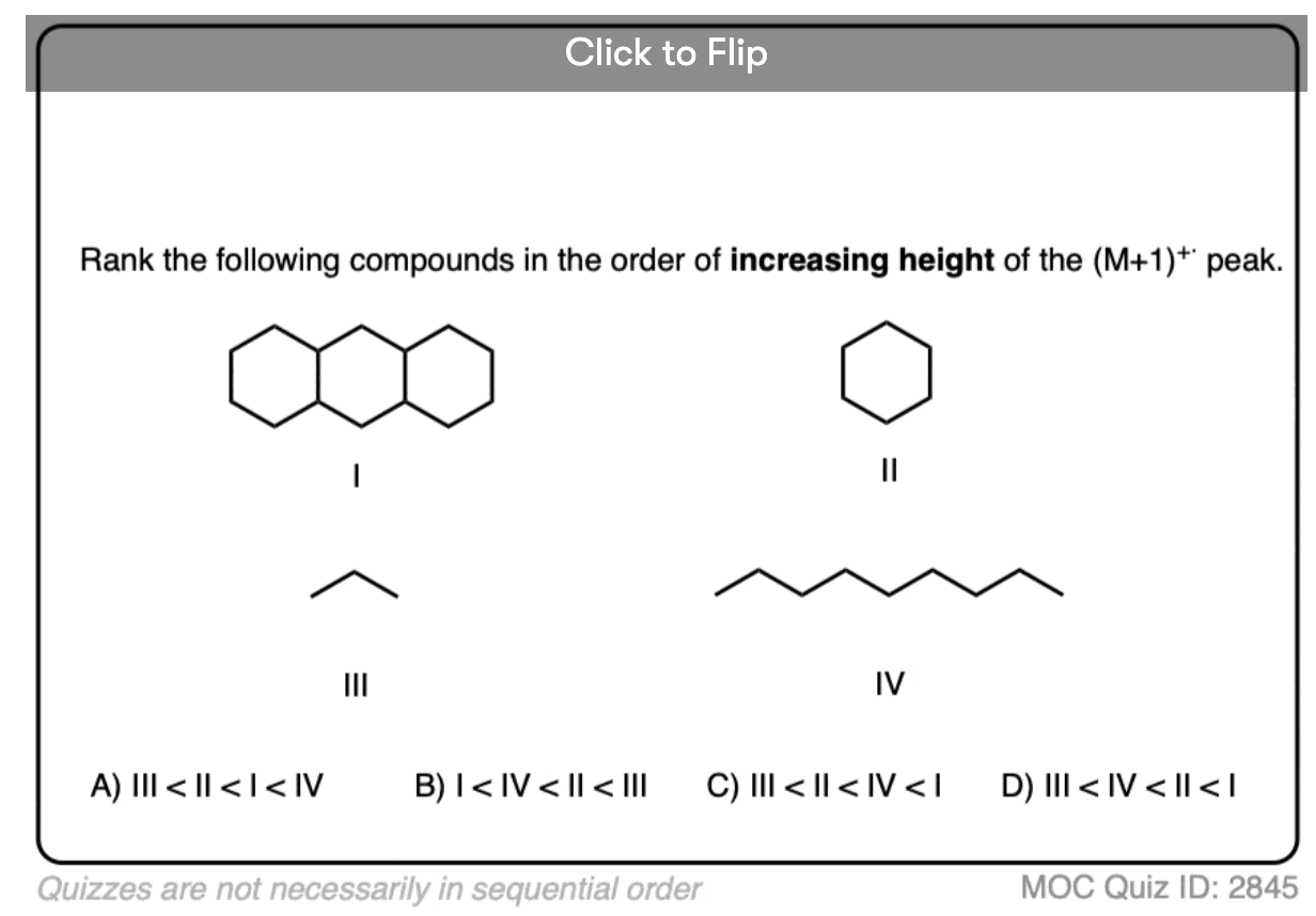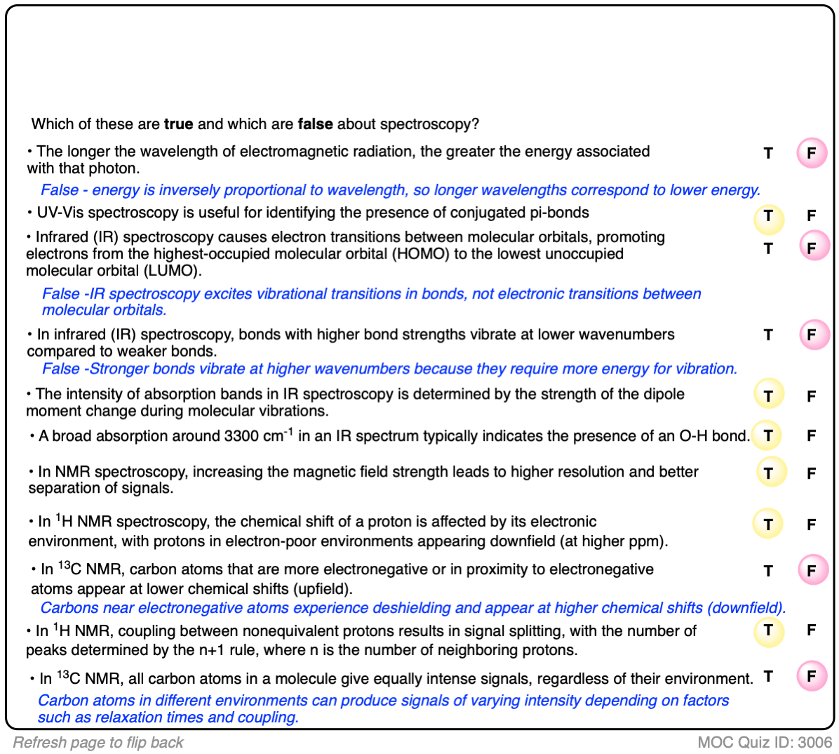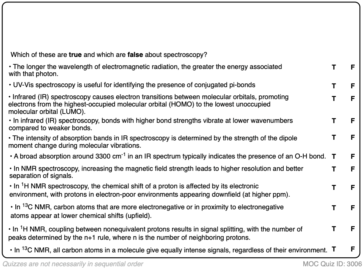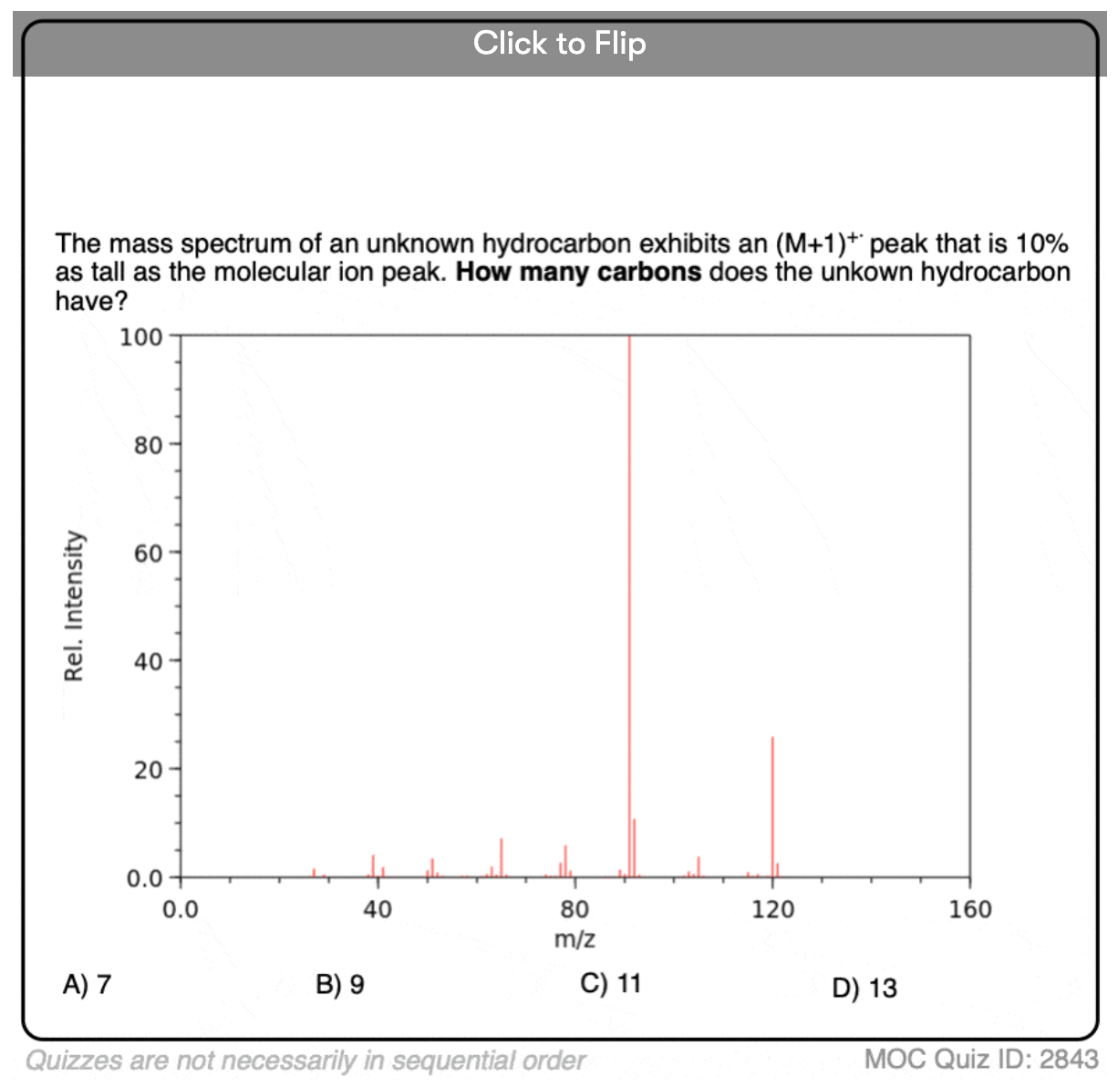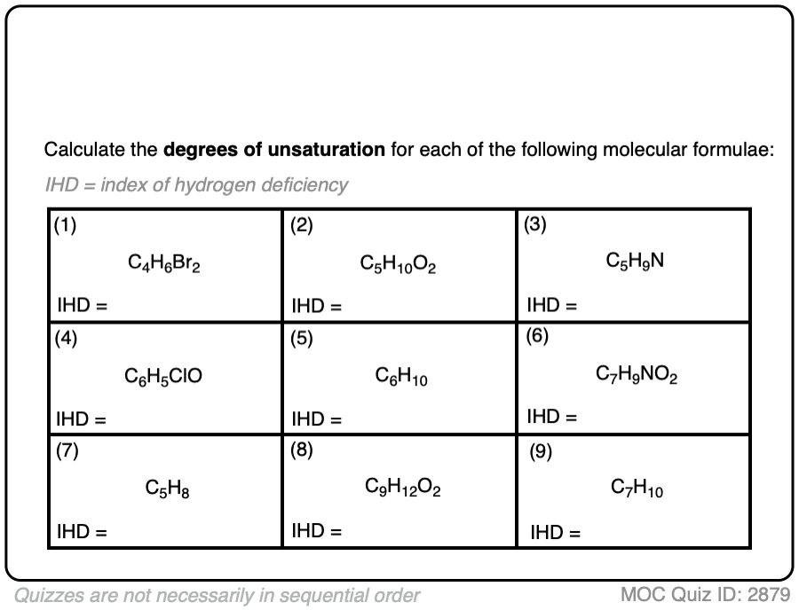 This page contains quizzes on spectroscopy topics, starting from the simplest – index of hydrogen deficiency – up to UV-Visible spectroscopy, IR spectroscopy, mass spectrometry (MS), and 13C and 1H NMR spectroscopy.