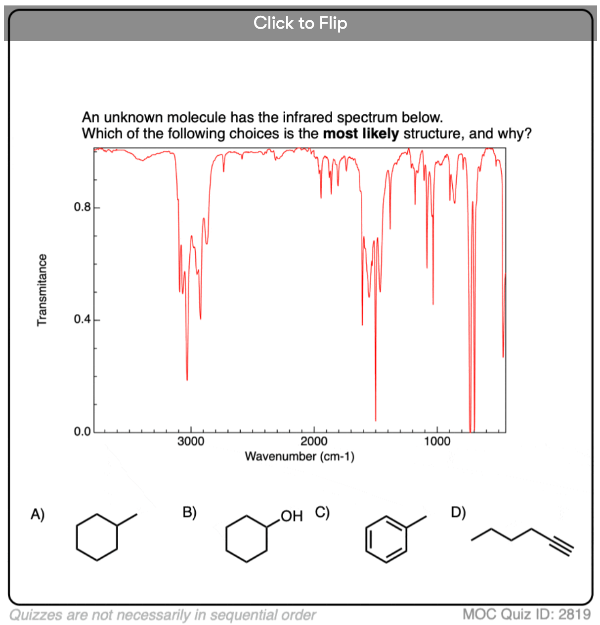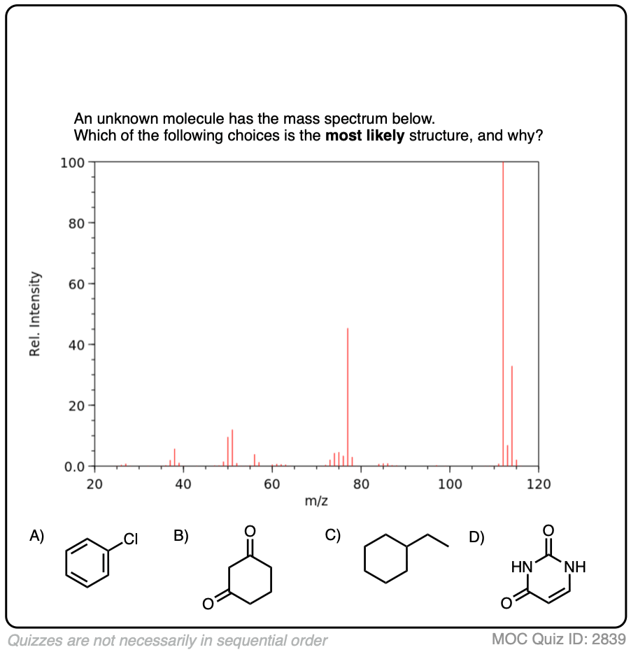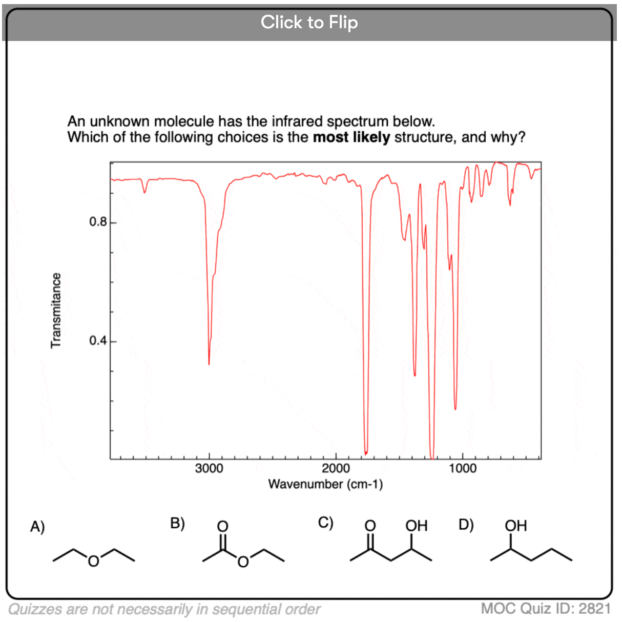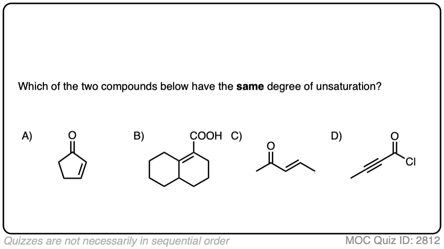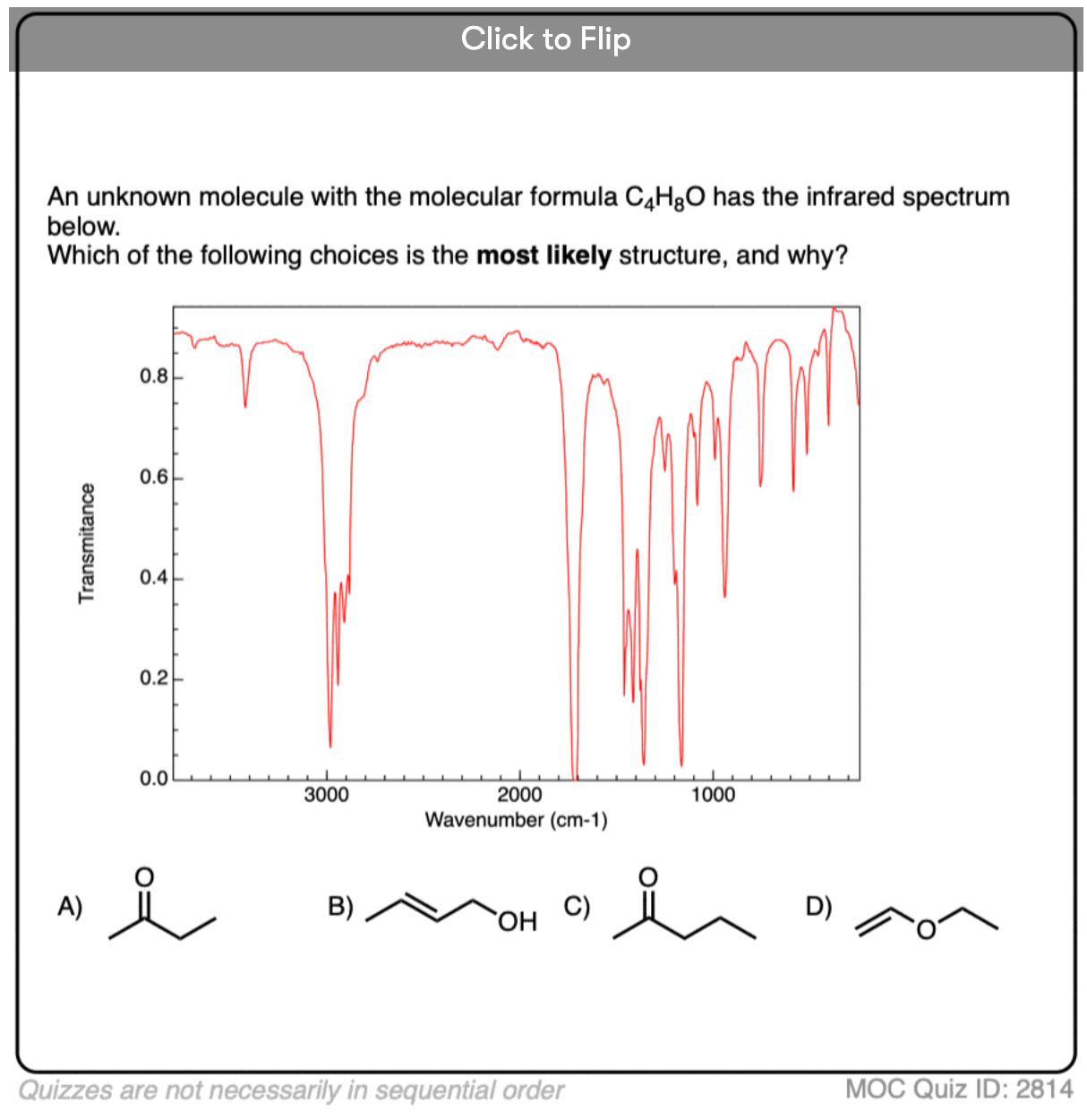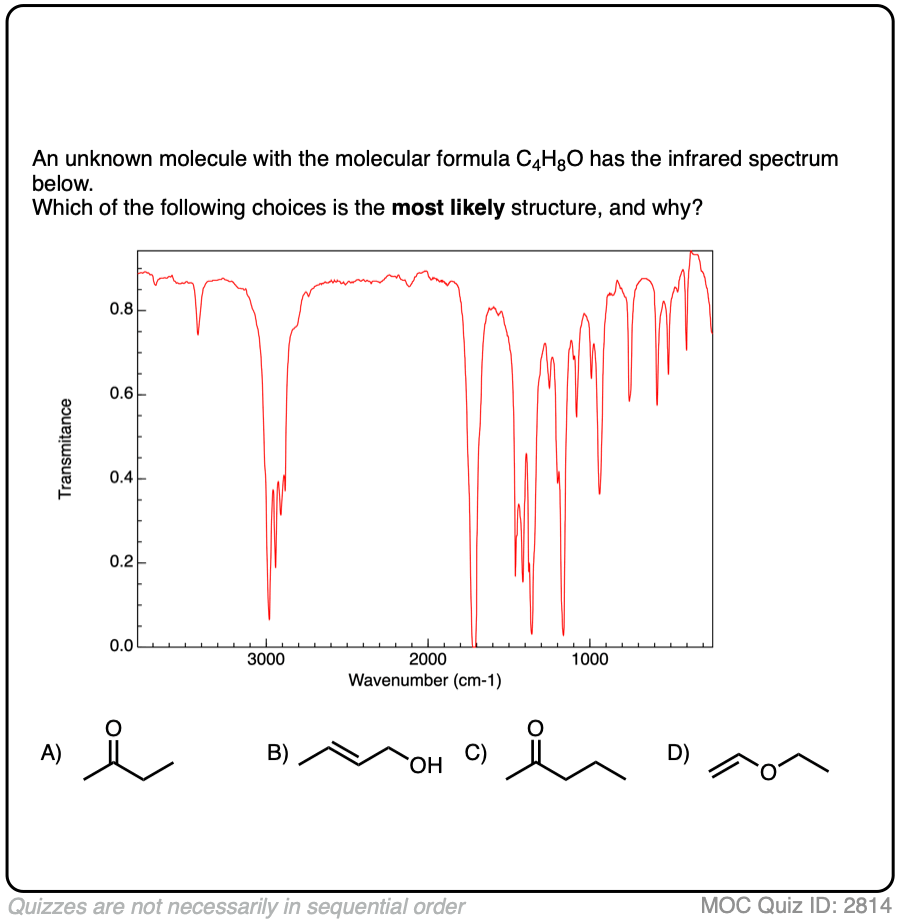 This page contains quizzes on spectroscopy topics, starting from the simplest – index of hydrogen deficiency – up to UV-Visible spectroscopy, IR spectroscopy, mass spectrometry (MS), and 13C and 1H NMR spectroscopy.