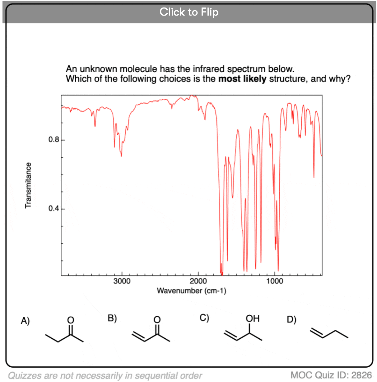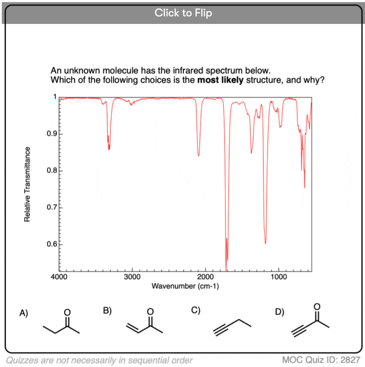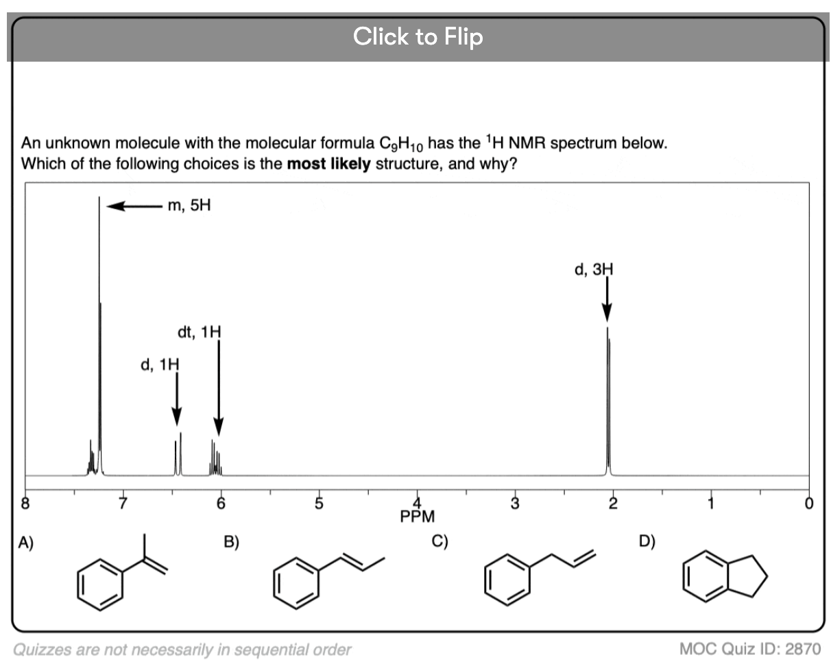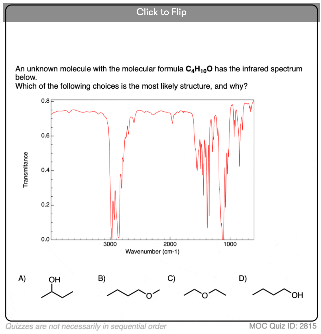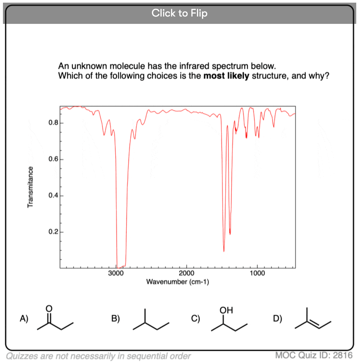 This page contains quizzes on spectroscopy topics, starting from the simplest – index of hydrogen deficiency – up to UV-Visible spectroscopy, IR spectroscopy, mass spectrometry (MS), and 13C and 1H NMR spectroscopy.