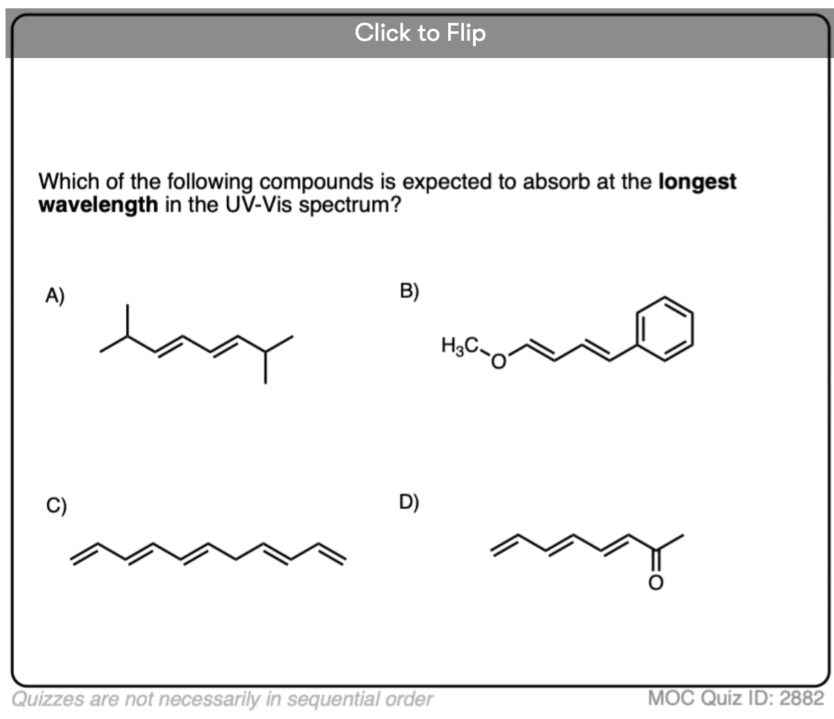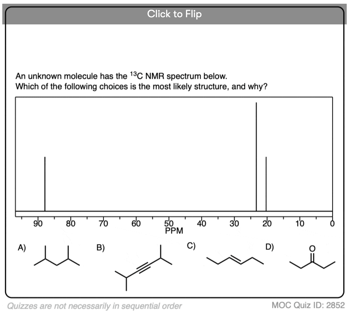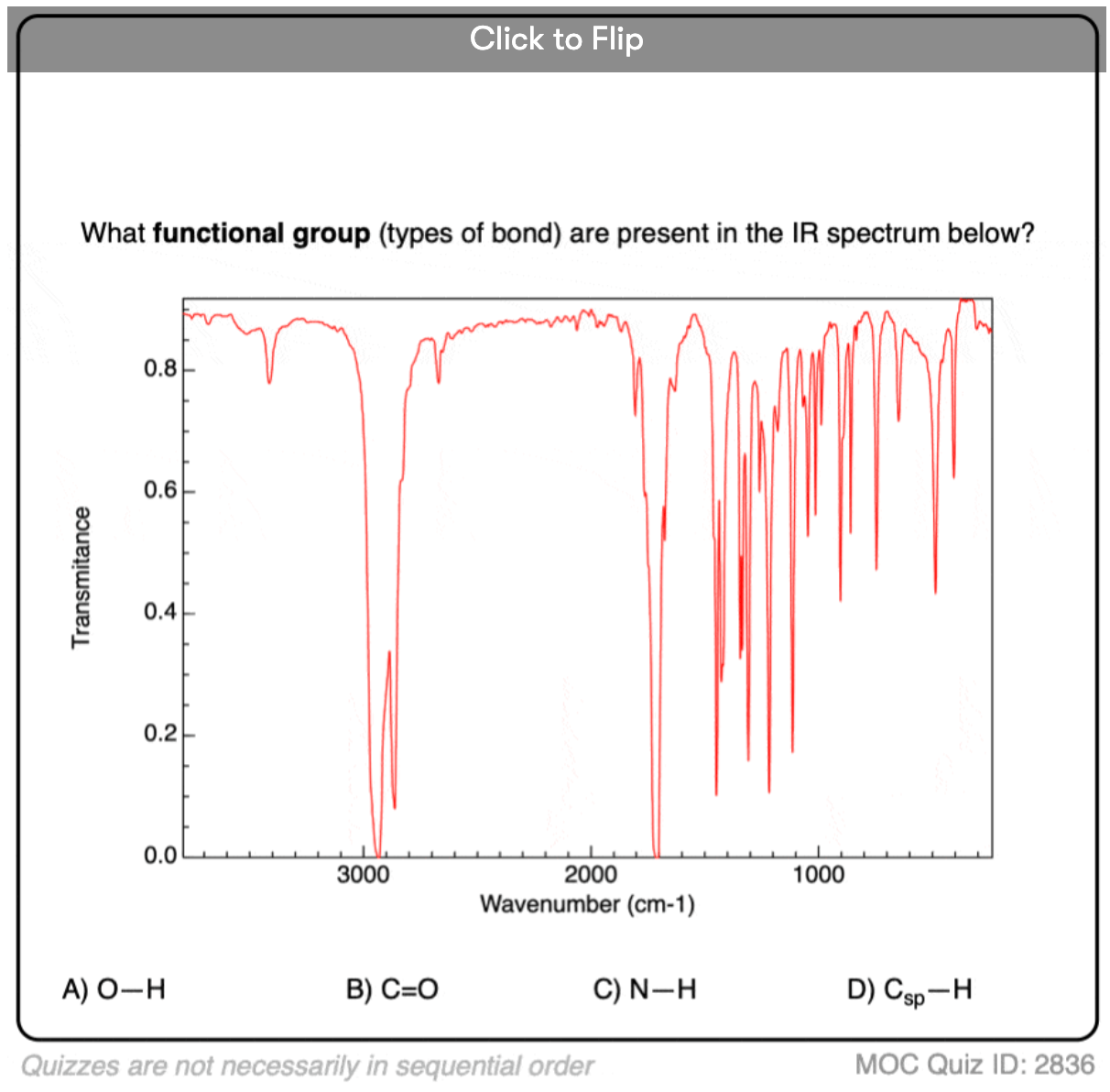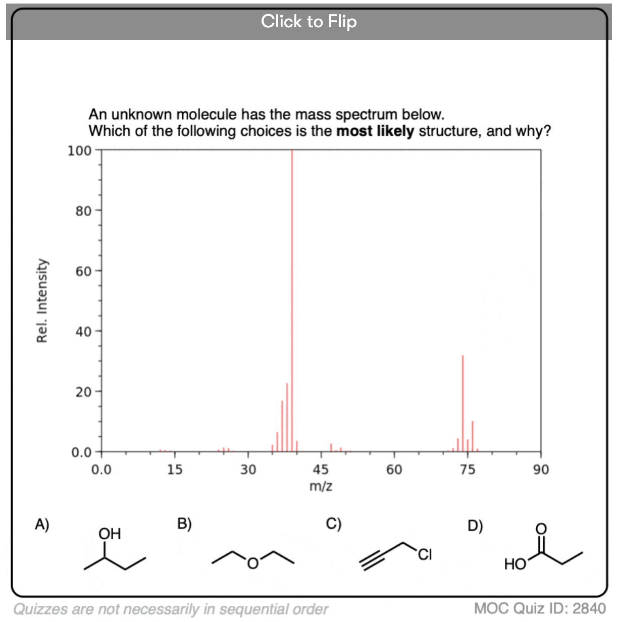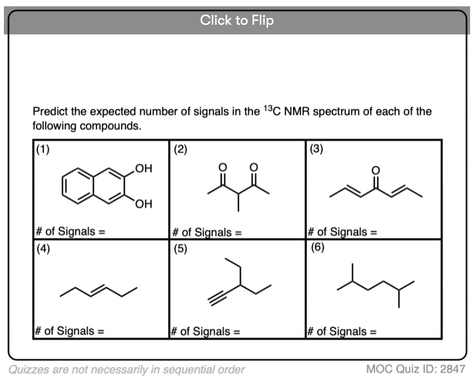 This page contains quizzes on spectroscopy topics, starting from the simplest – index of hydrogen deficiency – up to UV-Visible spectroscopy, IR spectroscopy, mass spectrometry (MS), and 13C and 1H NMR spectroscopy.