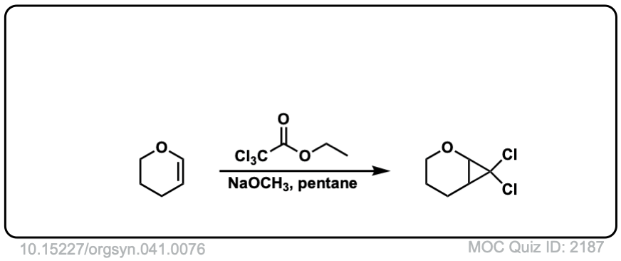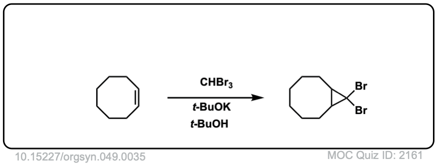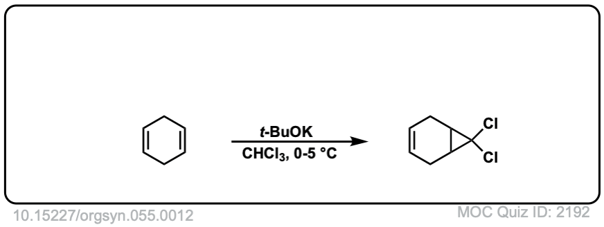 Description: Alkenes treated with chloroform (CHCl3) and strong base will form dichlorocarbenes, which add to alkenes to form cyclopropanes.