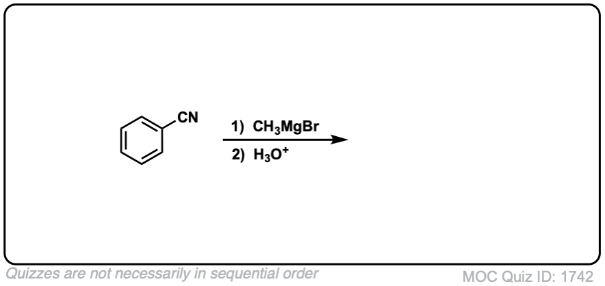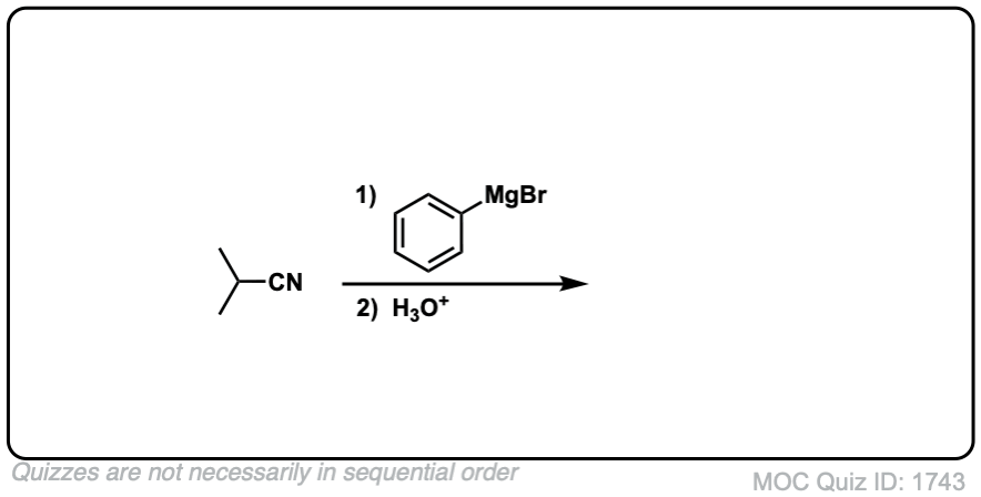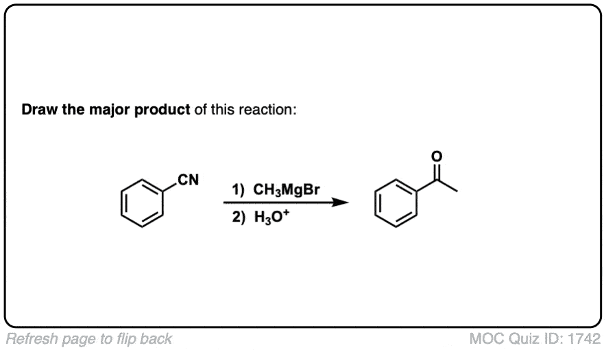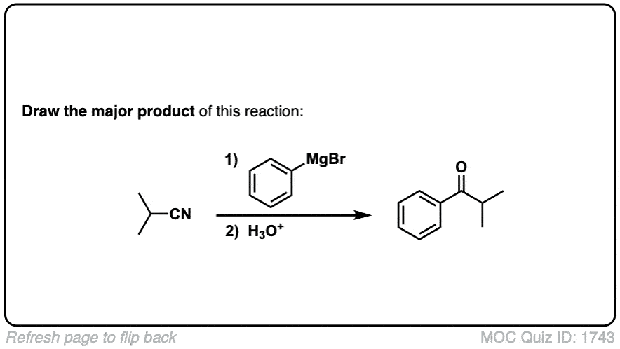 Notes: The first product of the reaction is an imine, which is then hydrolyzed to the ketone with water (or mild aqueous acid). Note the last (5th) example – don’t get distracted by the huge molecule, just pay attention to the nitrile!