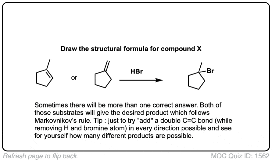 Notes: This is an addition reaction. Note that the bromine always ends up at the more substituted carbon of the alkene (Markovnikoff-selectivity)