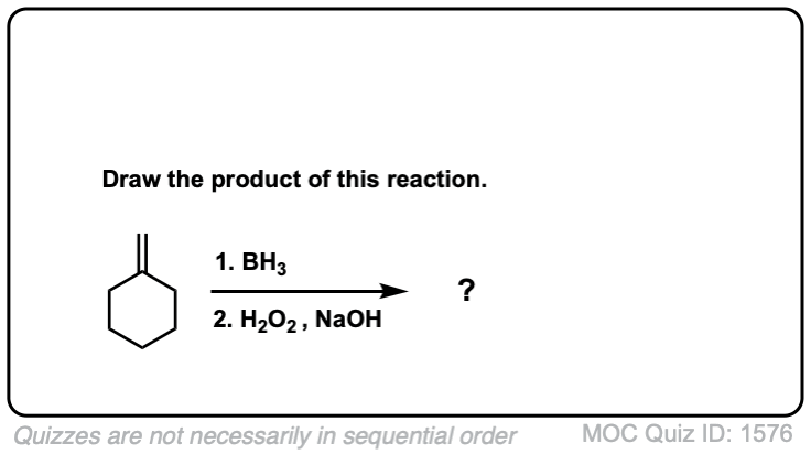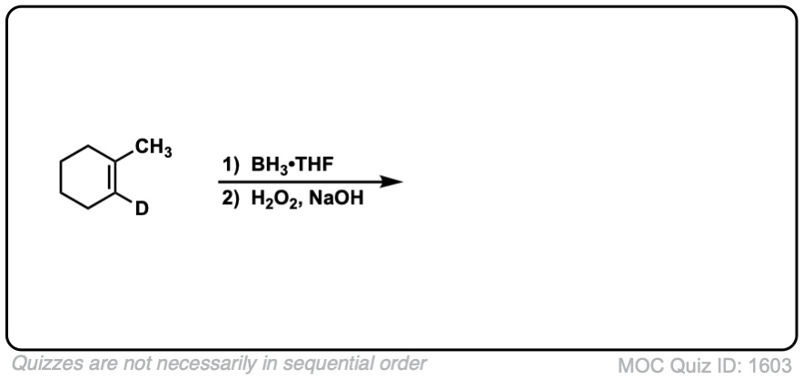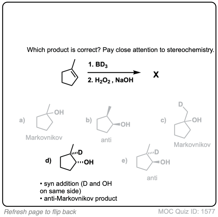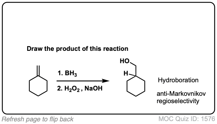 Notes: Note that the oxygen is always attached at the less substituted carbon (anti-Markovnikoff). Furthermore the stereochemistry is always syn (H and OH add to same side of the alkene).